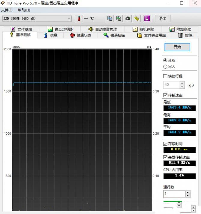 一般用戶在使用PC或者筆記本的時候經(jīng)常采用的是讀硬盤操作,只要讀數(shù)據(jù)穩(wěn)定,用戶在使用操作系統(tǒng)和軟件的時候就不會遇到卡頓的情況。所以穩(wěn)定的讀數(shù)據(jù)速度對用戶的體驗至關(guān)重要。CN600S 480GB在HD TUNE PRO中全盤讀取速度持續(xù)保持在1600MB/S,相比于SATA,NVME的速度有SATAIII最高值三倍以上的讀取速度。