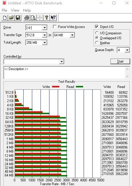 在ATTO測(cè)試中三星970PRO 1TB固態(tài)硬盤(pán)的成績(jī)依然亮眼,64MB的讀取速度高達(dá)3062 MB/S,最大連續(xù)寫(xiě)入則為2710MB/s。