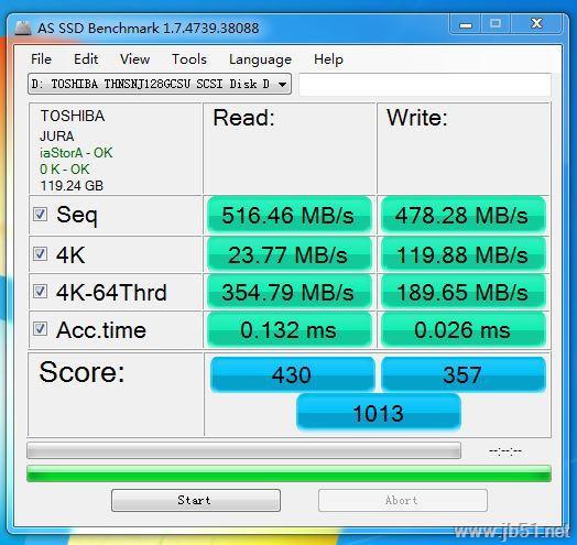 在AS SSD Benchmark軟件中,4K對齊以前是1024K-OK,現在竟然變成了0K-OK。但東芝Q Pro 128GB SSD的性能并沒有什么變化。
