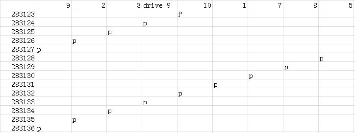 當9塊盤都定位到同一位置時,通過對比可以判斷校驗區的走向,繼而判斷整個RAID-5的走向。之前已經判斷出9號盤是第一塊盤了,把9號盤放在第一個位置,接著就可以判斷走向了,結果如圖6所示(drive9是第4塊盤)。確定RAID-5為左走向,盤序為9,2,3,4,10,1,7,8,5。