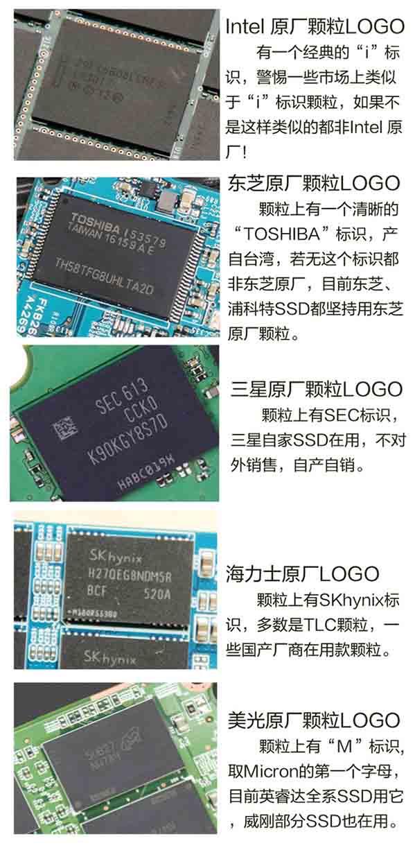 Intel、美光、三星、海力士、東芝、閃迪, 其中Intel與美光有合資廠,東芝與閃迪也有合資廠,三星與海力士則是單干,SSD所采用的閃存是不是原廠芯片 ,看看是否有原廠LOGO就知道。
