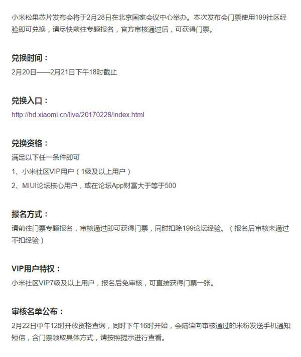 今天,小米官方發布消息稱,將于2月28日在北京國家會議中心舉辦小米松果芯片發布會。那么問題來了,我們怎么樣才能獲得發布會的門票呢?