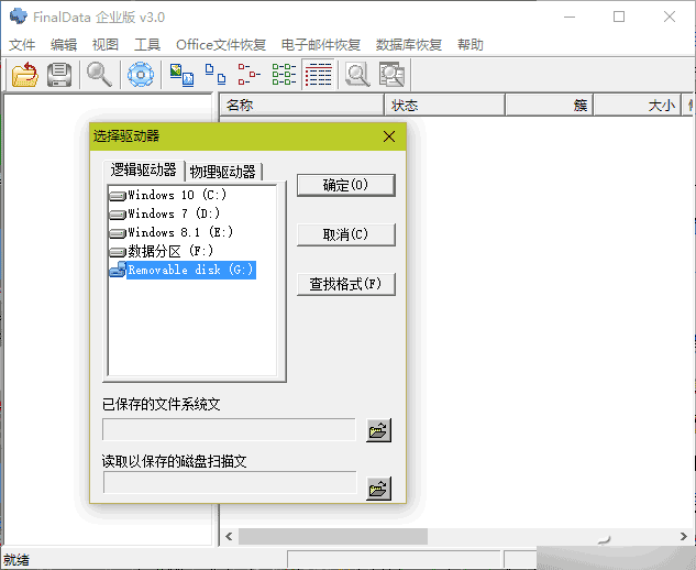 以管理員方式運(yùn)行并打開FinalData,點(diǎn)擊工具欄上的第一個(gè)按鈕,選擇要恢復(fù)的驅(qū)動(dòng)器。