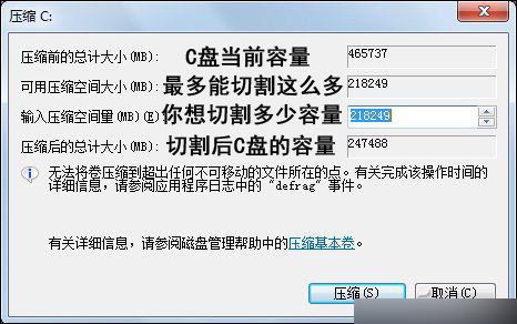 小編筆記本硬盤當前C盤容量約為460GB,系統允許我最多可以壓縮(切割)出218GB的容量用于建立D盤、E盤等其它分區,總之C盤最低的容量會限定在247GB左右。