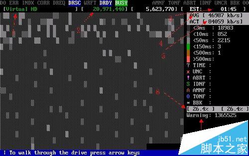5、然后你會看到很多區塊(簇),有黑有白的,如果你的硬盤有壞區的話,還有紅的,打叉的。我們看右邊紅框,分別是:
