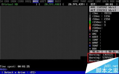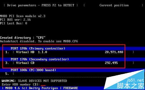 2、然后會看到MHDD運行的過程,很快就啟動完成了,這時到了選擇硬盤的界面,如圖(介于拍攝不方便,改用虛擬機來操作進行截圖),圖中,各個驅動器信息都可以看得到的,一般來說,大家在檢測硬盤時都是只接一個硬盤的,所以在這里選擇:1,再回車。