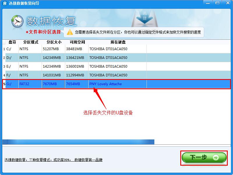 3、選擇丟失的文件所在的分區,即U盤,然后單擊“下一步”進行掃描。