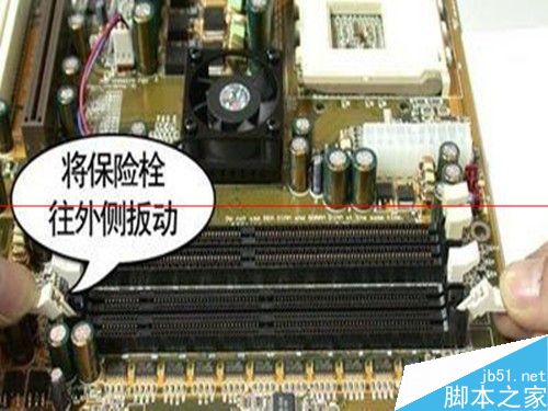 4、鎖扣,內存條主要鎖扣固定住,同時將兩鎖扣向兩邊推動。