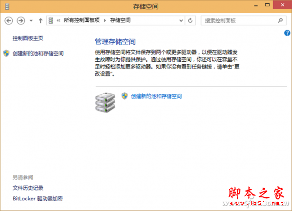 第三步:在“存儲空間”創(chuàng)建窗口中,點擊“創(chuàng)建新的池和存儲空間”。