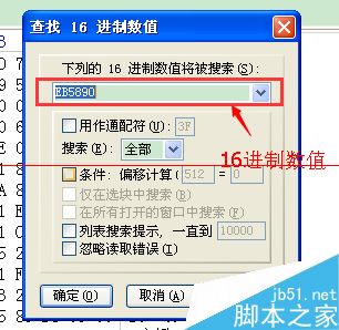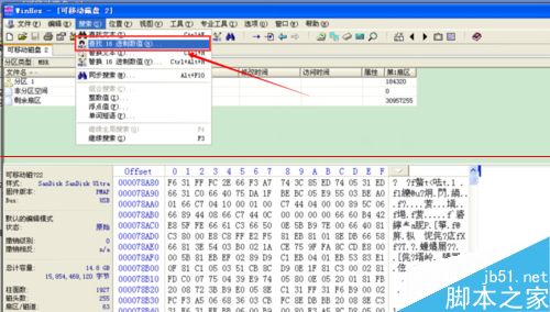3、點擊搜索項目欄,找到“查找 16進制數(shù)值”,搜索DBR標志,如果格式為FAT32,則搜索EB 58 90 (備份的DBR)在該分區(qū)的第6扇區(qū),如果格式為NTFS,則搜索EB 52 90 在該分區(qū)的最后一個扇區(qū)。