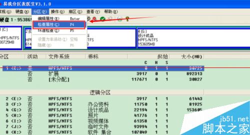 2、啟動易我分區表醫生V3.0后,選擇“分區→檢查分區”,軟件就會提示要E盤進行修復操作,回答“是”就可以將它恢復為NTFS格式并且能夠查看里面的文件了。