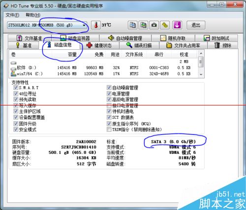 5、大家可以看到,不管現(xiàn)在你的硬盤(pán)是sata2還是sata3,Hd tune顯示的都是主板的接口類(lèi)型。這里顯示是Sata3,表示你的筆記本是支持sata3的,放心買(mǎi)吧。