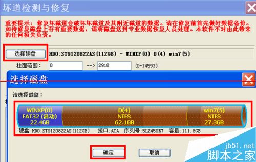 3、點擊"選擇硬盤",確認要檢查壞道的硬盤型號,容量等信息,選擇好后點擊確定.如果電腦里只有一個硬盤,可以跳過這一步.