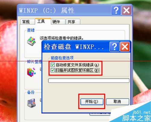 4、選中"自動修復文件系統錯誤","掃描并試圖恢復壞扇區",點擊"開始",軟件將會在下次開機時自動檢測文件系統并修復.如果是非系統盤,可以在強制卸載卷之后在windows下進行檢測修復.