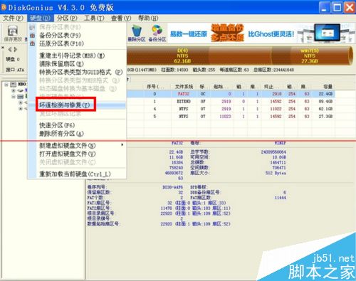 2、打開軟件,點擊"硬盤"菜單下的"壞道檢測與修復"