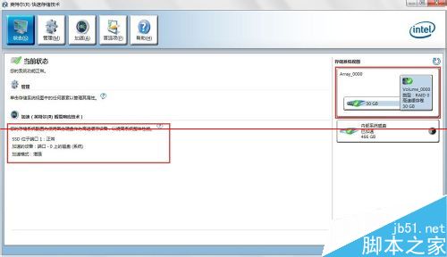 打開“英特爾快速存儲技術”,在“狀態”選項卡中查看,下圖是已經設置SSD加速的狀態