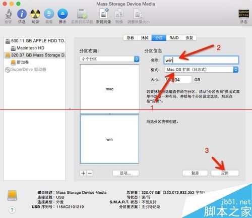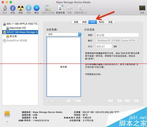 2、將移動硬盤插到mac上,稍等一會,磁盤工具將羅列插著的移動硬盤。右邊是對該硬盤的操作區(qū),點擊【分區(qū)】