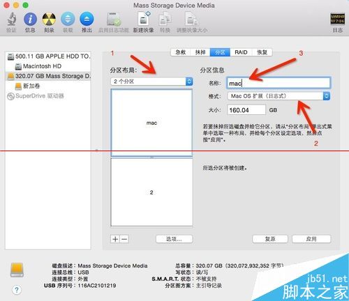 3、下拉分區(qū)布局,選擇【2個分區(qū)】,點擊第一個分區(qū),系統(tǒng)會將選中的分區(qū)顯示藍(lán)色框框。在【格式】中選中 【Mac OS擴展(日志式)】。修改【名稱】為mac。