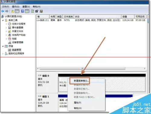 3、記住磁盤的序號(hào),如這里是磁盤0,選擇這塊磁盤,點(diǎn)擊右鍵,彈出菜單,選擇“新建簡(jiǎn)單卷”。