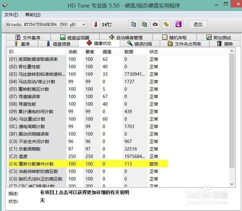 3、一段時(shí)間后,完成修復(fù),此時(shí)打開 HD Tune軟件檢測(cè)其健康狀態(tài),則黃色警告消失。但實(shí)際的硬盤損壞還是有的,只是軟件檢測(cè)不出了而已。