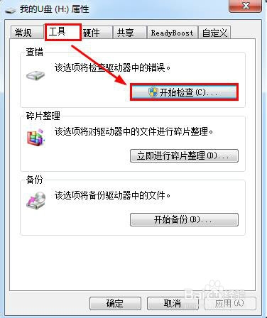 2、在彈出的U盤屬性窗口中,選擇“工具”標簽,再點擊“開始檢查”按鈕。