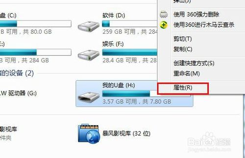 1、將鼠標移至U盤圖標上,然后右鍵單擊,在彈出的選項列表中點擊“屬性”選項。