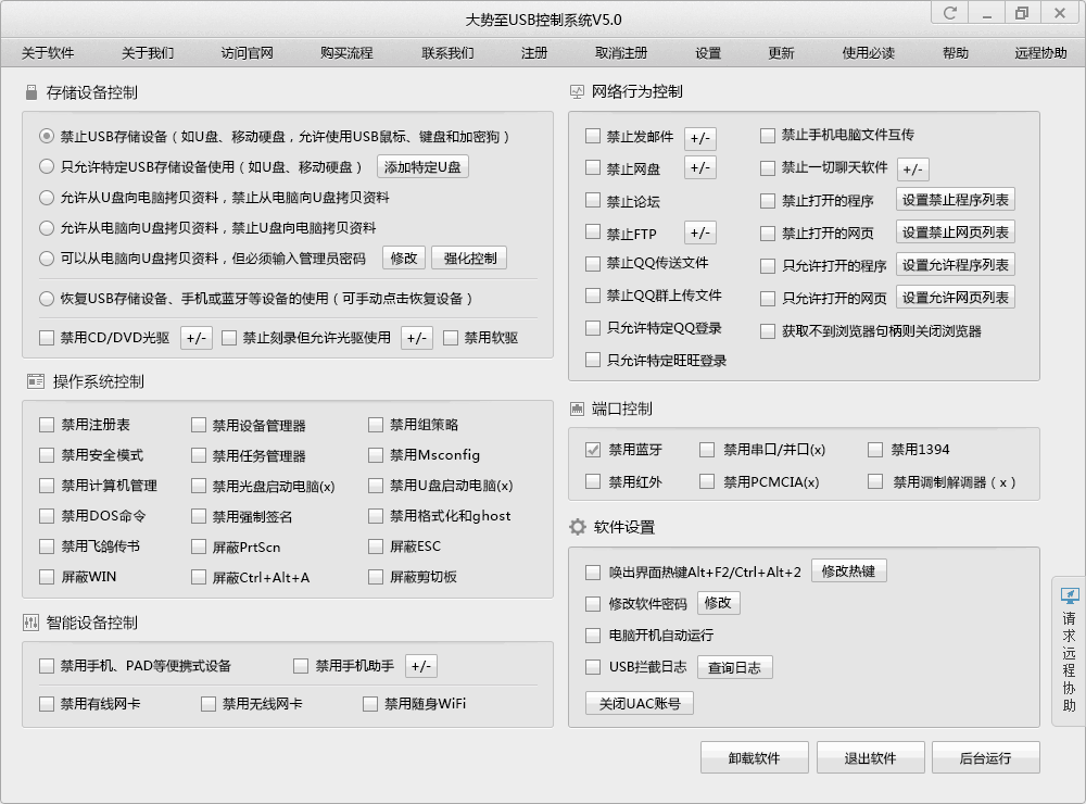 此外,還有一種方法借助于專門禁用USB存儲設(shè)備的軟件。例如有一款“大勢至USB端口禁用軟件”(下載地址:http://www.grabsun.com/monitorusb.html),只需要在電腦安裝之后,就可以自動禁用U盤、移動硬盤、手機等USB存儲設(shè)備而不影響非USB存儲設(shè)備(如USB鼠標(biāo)、鍵盤和加密狗的使用),同時還可以禁止電腦發(fā)郵件、禁止網(wǎng)盤上傳文件、禁止FTP文件上傳、禁止論壇發(fā)送附件以及禁止聊天軟件傳輸文件等,全面保護(hù)電腦文件安全。同時操作也非常簡單,點點鼠標(biāo)就可以了,有興趣的用戶可以下載使用。