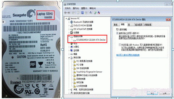 SSHD混合硬盤,其NAND閃存都是內(nèi)置在硬盤中,對于操作系統(tǒng)來講,它是一塊硬盤。又因為NAND閃存為硬盤的熱數(shù)據(jù)進(jìn)行緩存使用來提高訪問速度,由硬盤主控驅(qū)動器來自行控制,故用戶無法自由分配,在磁盤管理、設(shè)備管理器中無法看到內(nèi)置SSD緩存的容量。如下圖一塊1TB的Seagate1TB的筆記本SSHD在磁盤管理器及設(shè)備管理器顯示的截圖如下: