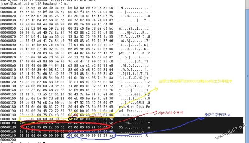 主引導程序占446個字節,dpt占64個字節(4個分區,一個分區16個字節),還有2個字節55AA