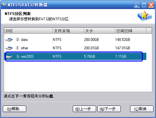 3、在NTFS分區(qū)列表中選擇一個(gè)你想轉(zhuǎn)換到FAT32的NTFS分區(qū),這里我們選中G盤(pán),然后點(diǎn)擊“下一步”或“Next”按鈕:(注意:這個(gè)程序不能直接轉(zhuǎn)換系統(tǒng)分區(qū)C盤(pán))