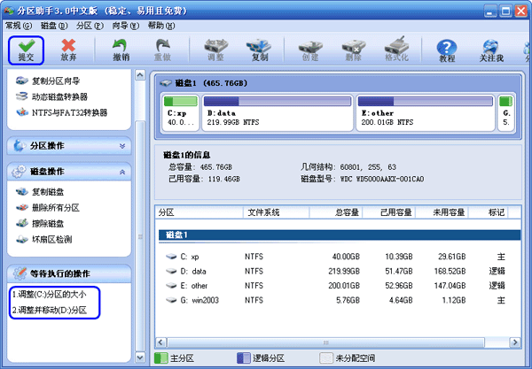 6、最后不要忘記點擊工具欄上的“提交”按鈕來執(zhí)行真實的操作,另外你可以在主界面上看到等待執(zhí)行的操作中有兩個操作(藍色框圈住的地方),如下圖6,即把這個操作保存到磁盤上。執(zhí)行過程中可能需要花一會時間,所花時間的長短由分區(qū)中的數(shù)據(jù)的多小而定。這需要你耐心地等待,絕對不要強行終止程序。