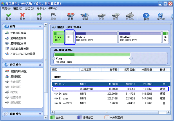3、當你松開鼠標時,你將看到在C盤后產(chǎn)生了一塊19.99GB的未分配空間(藍色框圈住的地方),如下圖3,這塊空間就是壓縮出來的,同時我們可以繼續(xù)使用分區(qū)助手將這塊空間分配給D盤使用。