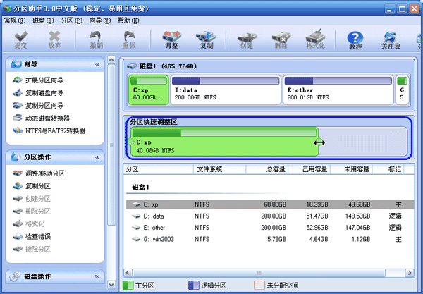 2、這步的目標是縮小C盤,請選中C盤并移動鼠標到“分區(qū)快速調(diào)整區(qū)”的最右端,然后當鼠標指針變成雙向箭頭時,點擊圓形的手柄并向左拖動鼠標來縮小這個分區(qū)到40GB,如下圖2所示:(你也可以右擊C盤選擇“調(diào)整/移動分區(qū)”選項來縮小C分區(qū))