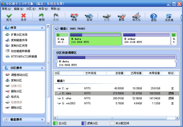 1、下載免費的分區(qū)助手,安裝并運行它。在主界面上你可以看到C盤有60GB的空間,D盤有200GB的空間,如圖1。這個例子將壓縮C盤到40GB將壓縮出的空間分配給D盤使用,使D盤達到大約220GB的空間。
