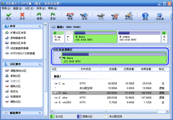 4、點擊D盤,并移動鼠標到“分區(qū)快速調(diào)整區(qū)”的最左端,然后當鼠標指針變成雙向箭頭時,點擊圓形的手柄并向最左邊拖動鼠標以讓D盤占用這19.99GB的未分配空間,如下圖4所示:(你也可以右擊D盤選擇“調(diào)整/移動分區(qū)”選項來設定D分區(qū)的新大小)