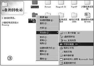 打開桌面上的“U盤的回收站”,選擇相應的內容,右鍵單擊選擇“發送到可移動磁盤”即可(如圖3)。