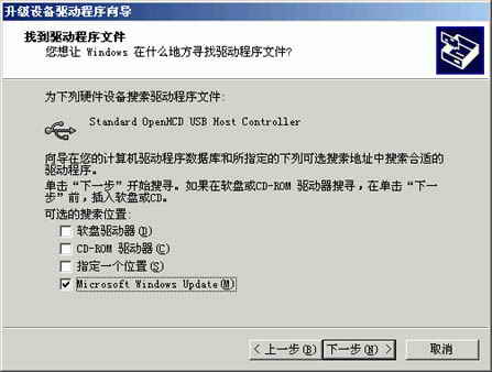 在確保主板USB端口被激活后,再在設備管理器窗口中,雙擊USB端口控制器選項,然后進入“驅動程序”標簽頁面,檢查一下USB端口控制器的驅動程序是否是最新的,要是不是最新的話,那么計算機USB端口標準可能就會與當前移動硬盤的USB接口標準不一致,從而造成移動硬盤盤符出現丟失現象。此時,你可以單擊“更新驅動程序”按鈕,然后逐步單擊“下一步”按鈕,當出現如圖4所示的提示時,最好選中“Microsoft Windows Update”選項,接著再按照提示順利完成驅動程序的更新操作;更新之后的USB端口,其接口標準就可能與當前移動硬盤的USB接口標準一致了。