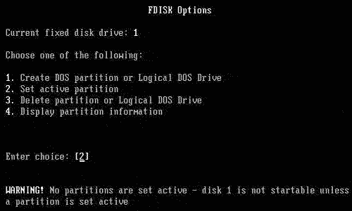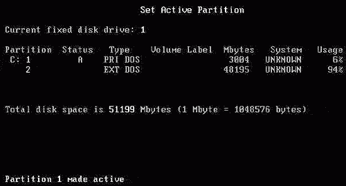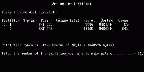 選擇數字“1”,即設C盤為活動分區。當硬盤劃分了多個主分區后,可設其中任一個為活動分區。