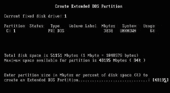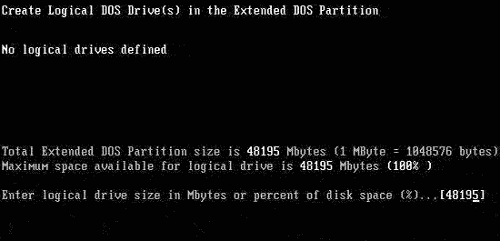 習慣上我們會將除主分區之外的所有空間劃為擴展分區,直接按回車即可。當然,如果你想安裝微軟之外的操作系統,則可根據需要輸入擴展分區的空間大小或百分比。