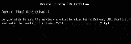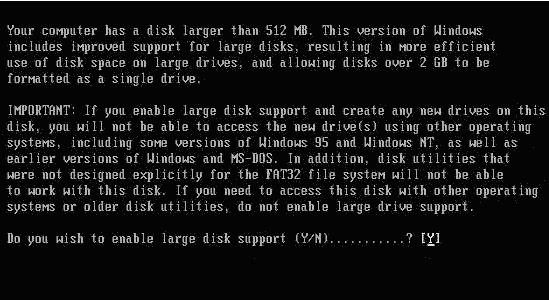 畫面大意是說磁盤容量已經超過了512M,為了充分發揮磁盤的性能,建議選用FAT32文件系統,輸入“Y”鍵后按回車鍵。