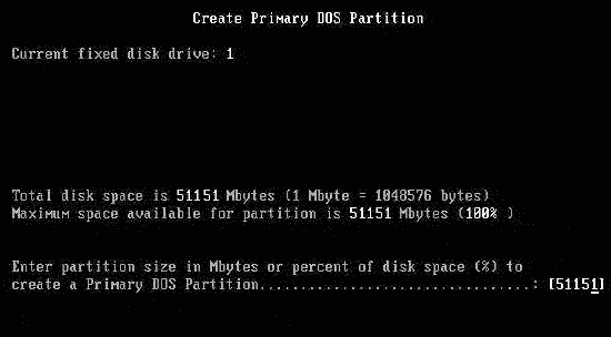 設置主分區的容量,可直接輸入分區大小(以MB為單位)或分區所占硬盤容量的百分比(%),回車確認。