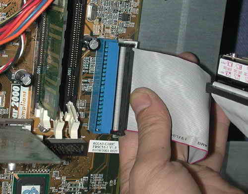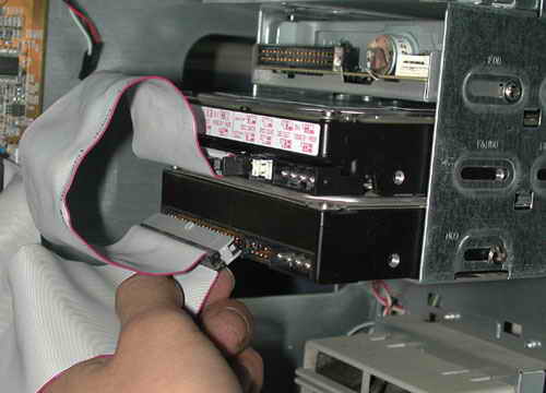打開機箱,將硬盤裝入機箱的3.5英寸的安裝架,并用螺釘固定。將第一根IDE數據線未端插入老硬盤的IDE接口,IDE數據線中端插入新硬盤的IDE接口,如圖4所示。而且,IDE數據線的Pin1(也就是紅邊)必須與硬盤和IDE接口的Pin1相連接。最后再將梯形的四針電源插頭接到硬盤的電源插座上。