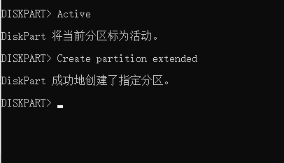 5、輸入Create partition extended,點擊回車鍵,剩余的磁盤空間全部劃分為擴展分區(qū)。