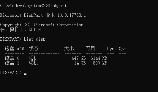 2、輸入Diskpart,點擊回車鍵進入工具,再次輸入List disk,點擊回車鍵查看需要設(shè)置分區(qū)的U盤符號。