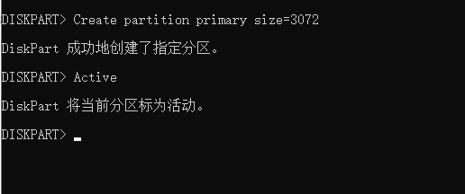 4、輸入Create partition primary size=3072,點擊回車鍵創(chuàng)建一個3G的主分區(qū),然后再次輸入Active點擊回車鍵激活。