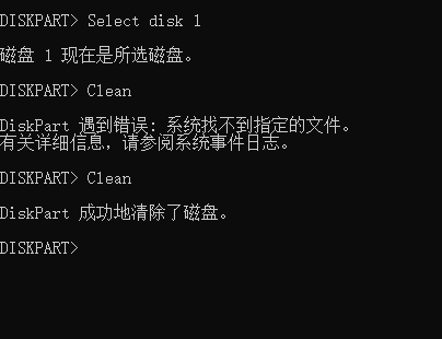 3、輸入Select disk 1,這里1是要分區(qū)U盤的符號,點擊回車鍵進入該U盤,然后再次輸入Clean,點擊回車鍵清除U盤數(shù)據(jù)。