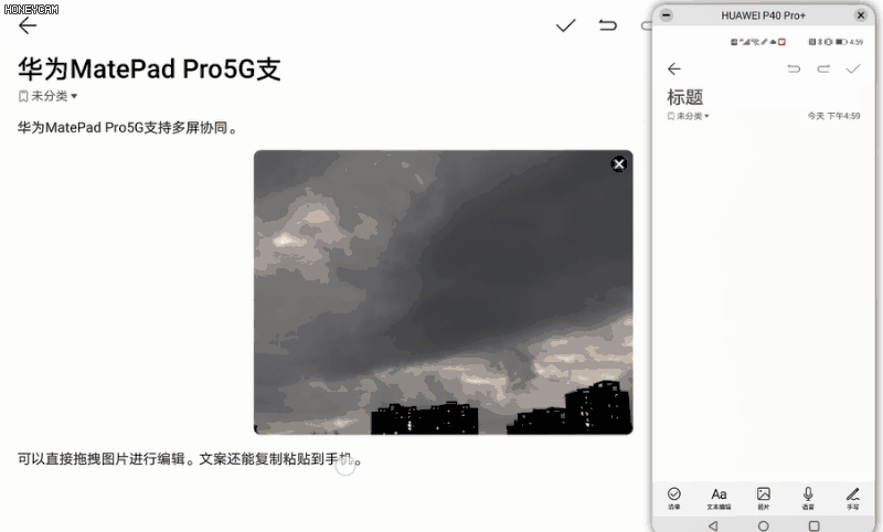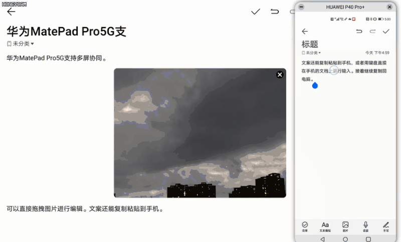 華為 MatePad Pro 5G 的首選最佳伴侶,自然是華為手機。而同時使用華為 MatePad Pro 5G 和華為手機時,多屏協同玩法將發揮到巔峰。首先,拖拽互傳功能可以省去數據線連接,無需第三方在中間搭橋,直接在華為 MatePad Pro 5G 和手機之間雙向傳輸數據。你還可以將手機的本地圖片拖拽到華為 MatePad Pro 5G 正在編輯的文檔中,編輯完畢后,華為 MatePad Pro 5G 再以拖拽的方式把文檔拖拽回手機設備。假設同一公司的同事也在使用華為設備,那么你們的辦公交互將變得極具趣味性。