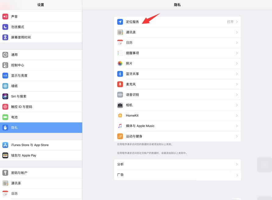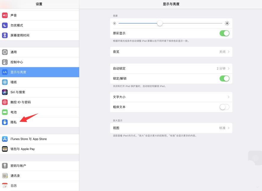 1、我們在iPad Pro平板電腦設置頁面中,點擊打開隱私選項
