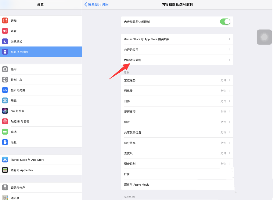 以上就是iPad Pro平板訪問限制的設置過程,希望大家喜歡,請繼續關注武林網。