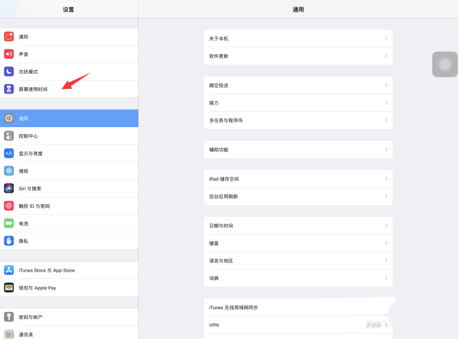 2、在iPad設置頁面中,點擊打開屏幕使用時間選項